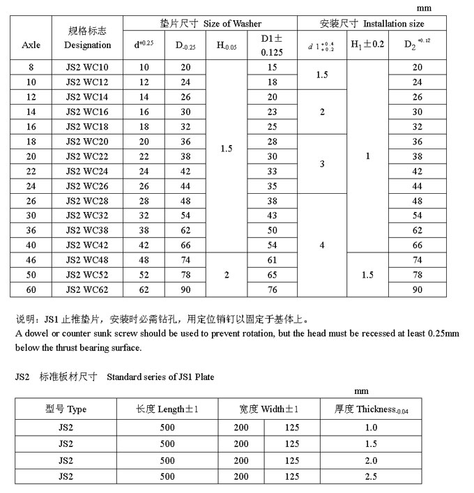 JS2 系列止推墊片標準尺寸