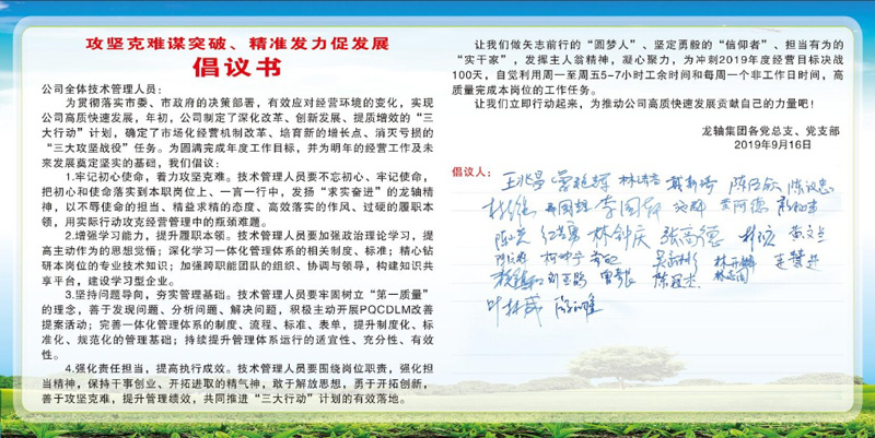 2019年9月16日,公司各黨總支、黨支部在二樓會議室開展 “攻堅克難謀突破、精準(zhǔn)發(fā)力促發(fā)展”倡議書簽名活動。航空事業(yè)部黨支部書記王兆昌代表公司各黨總支、黨支部向全體技術(shù)管理人員發(fā)出倡議:一要牢記初心使命,著力攻堅克難;二要增強學(xué)習(xí)能力,提升履職本領(lǐng);三要堅持問題導(dǎo)向,夯實管理基礎(chǔ);四要強化責(zé)任擔(dān)當(dāng),提高執(zhí)行成效。號召全體技術(shù)管理人員做矢志前行的“圓夢人”、堅定勇毅的“信仰者”、擔(dān)當(dāng)有為的“實干家”,發(fā)揮主人翁精神,凝心聚力,為沖刺2019年度經(jīng)營目標(biāo)決戰(zhàn)100天,自覺利用周一至周五5-7小時工余時間和每周一個非工作日時間,高質(zhì)量完成本崗位的工作任務(wù)。最后,各黨總支(支部)書記依次在倡議書上簽字。