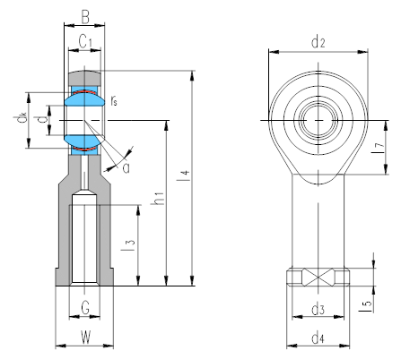 產品特點:自潤滑組裝桿端關節軸承桿端體材料是碳鋼,表面鍍鋅;外圈材料是青銅,滑動表面襯有PTFE復合材料,無需潤滑;內圈材料是軸承鋼,淬火,球面鍍硬鉻。