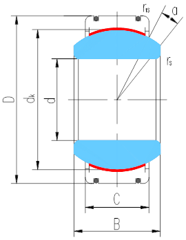 產品特點:外圈沿軸向剖分成兩半,用鎖圈固定,外圈材料為軸承鋼,淬火,球面粘貼PTFE編織物;內圈材料為軸承鋼,淬火,球面鍍硬鉻,后置代號有-2RS為外圈兩端帶有密封圈。