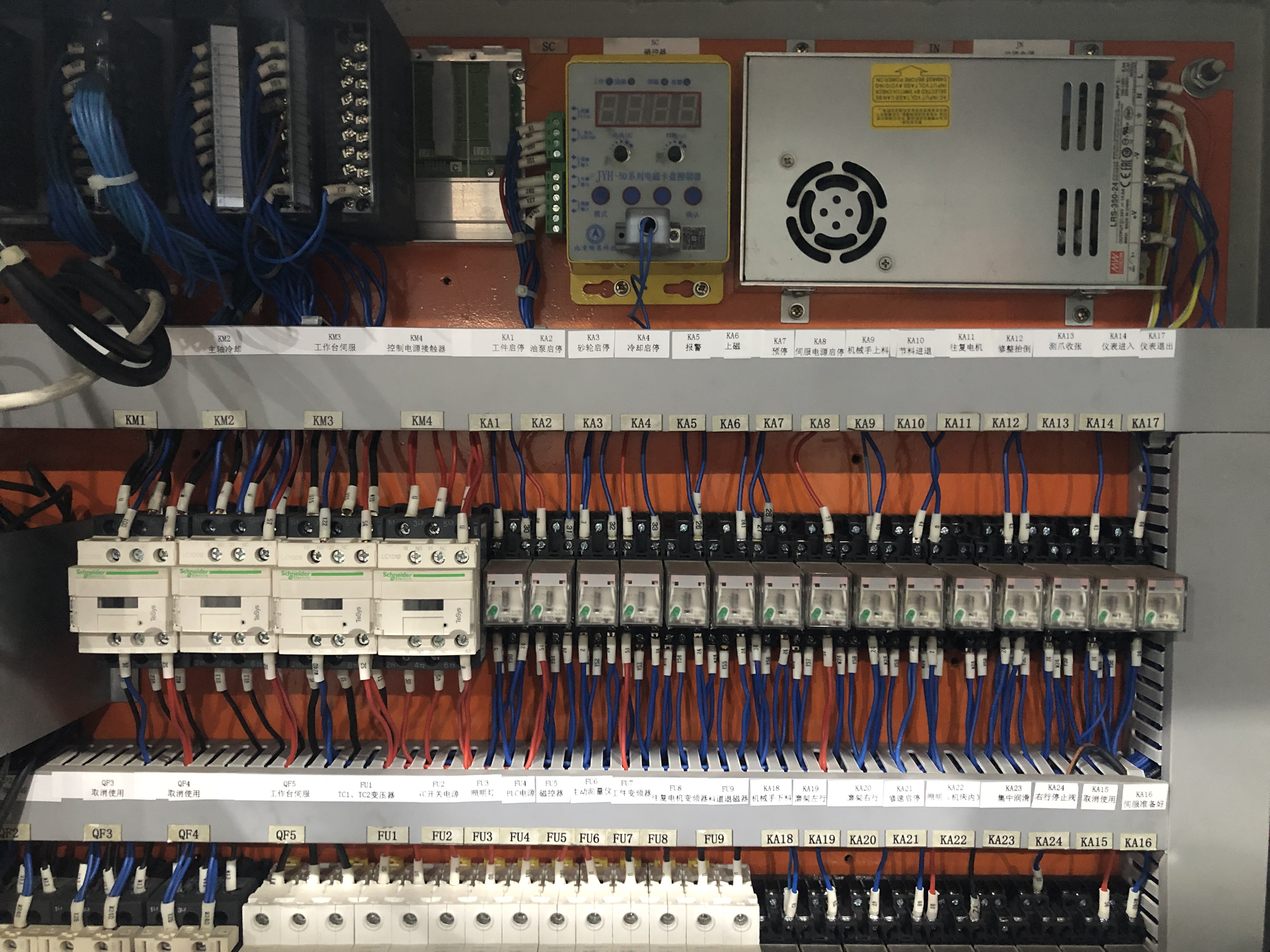 8、機床電氣柜內電氣元件標識要求:所有的電氣元器件、電線都必須要求有唯一的標識,標識的內容要求和電氣圖紙資料中的標識相一致;電氣元件標識位于電氣元件正上方,除了標出與圖紙一致的元件代號外,應標出終端負載(或控制下一層級)電氣元件的中文名稱,例如: