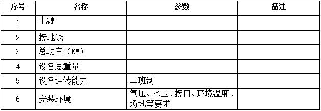 3.設(shè)備其他技術(shù)指標(biāo):(需含設(shè)備總功率、電壓、電流、氣壓、水壓、接口、環(huán)境溫度、場地等安裝環(huán)境有關(guān)要求)