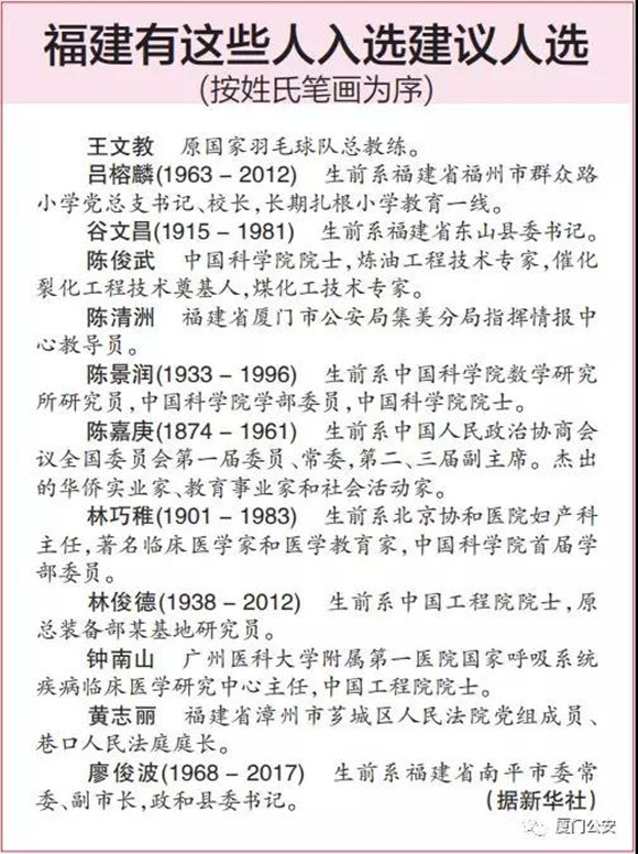 ????在前期的遴選推薦、群眾網(wǎng)上投票、組委會(huì)集中審議、中央和國(guó)家機(jī)關(guān)有關(guān)部門(mén)認(rèn)真審核下,組委會(huì)于9月15日公示了300名“最美奮斗者”建議人選名單。其中,“時(shí)代楷模”、全國(guó)公安系統(tǒng)一級(jí)英模、廈門(mén)市公安局民警陳清洲和漳州市薌城區(qū)人民法院黨組成員、巷口人民法庭庭長(zhǎng)黃志麗榜上有名。同時(shí),福建共有12人入選建議人選名單。